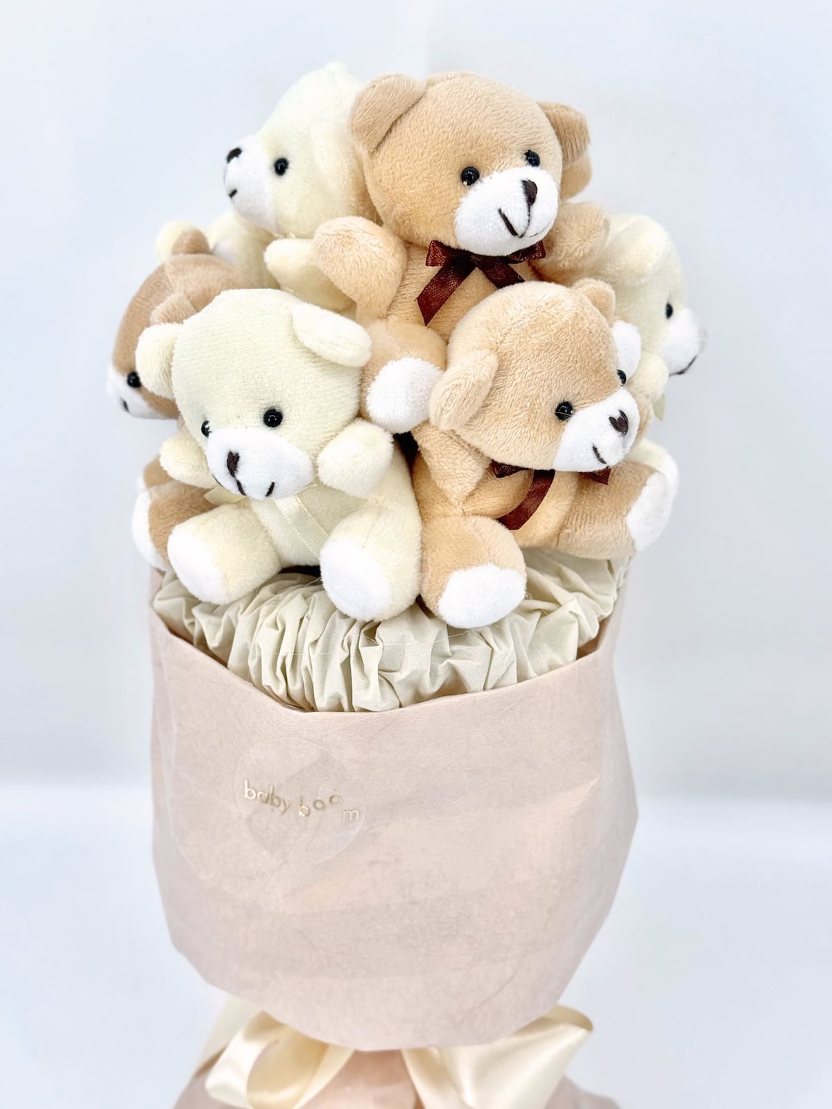 Mini medeki složeni su u elegantan papir nježnih bež tonova, koji cijelom buketu daje profinjen i topao izgled. Idealan je izbor za rođenje bebe, baby shower ili kao mali znak ljubavi i pažnje za najmlađe.