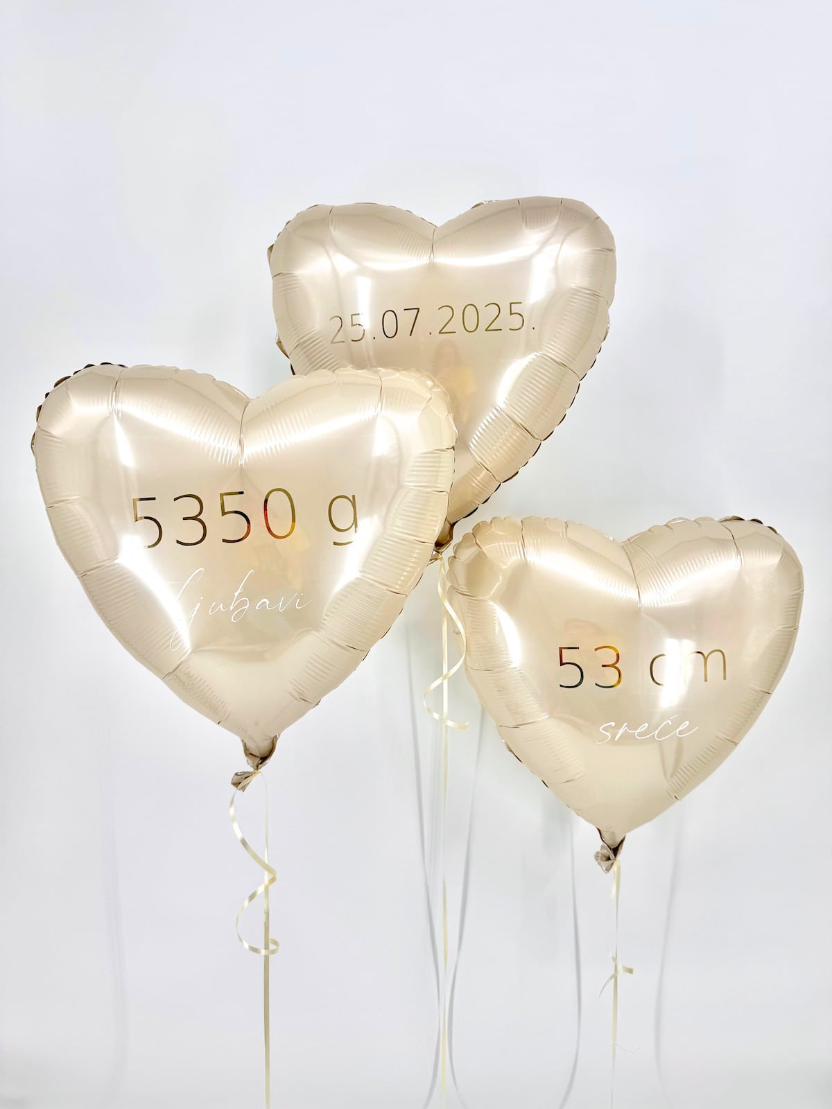 Tri folija balona u obliku srca u blagoj bež boji, stvoreni su za nježnu atmosferu dočeka bebe. Svaki balon ima personalizirani natpis s datumom, vremenom rođenja, težinom i visinom bebe – mala uspomena koju ćete čuvati zauvijek.