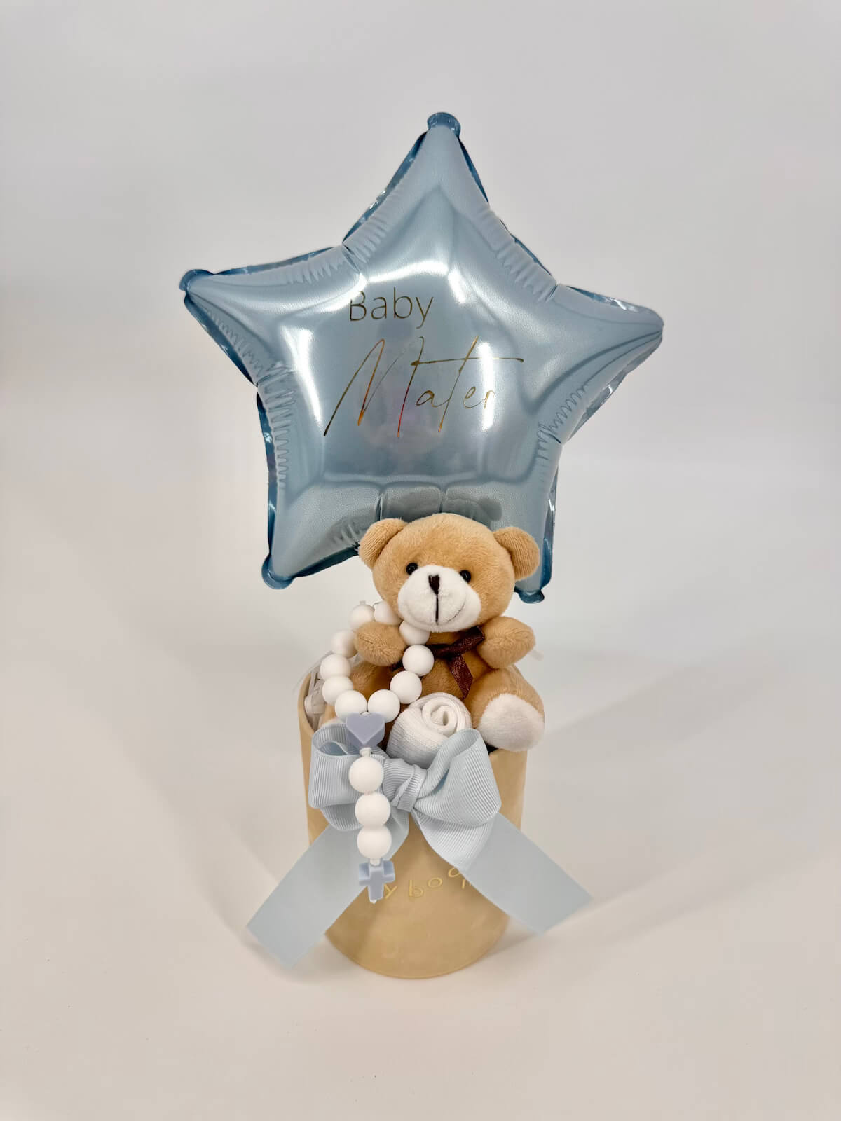 • Dekorativni balon u obliku zvjezdice na koji je moguće staviti personalizirani natpis imena bebe kao posebni detalj poklona.