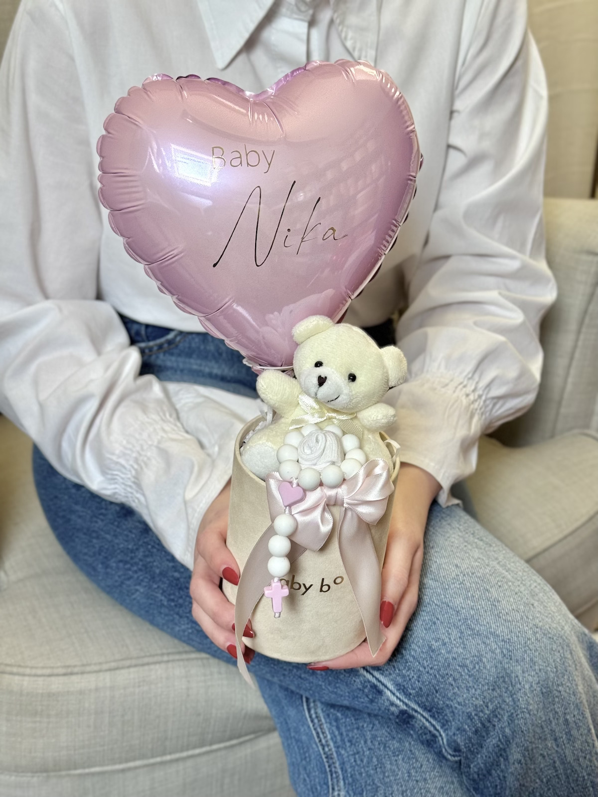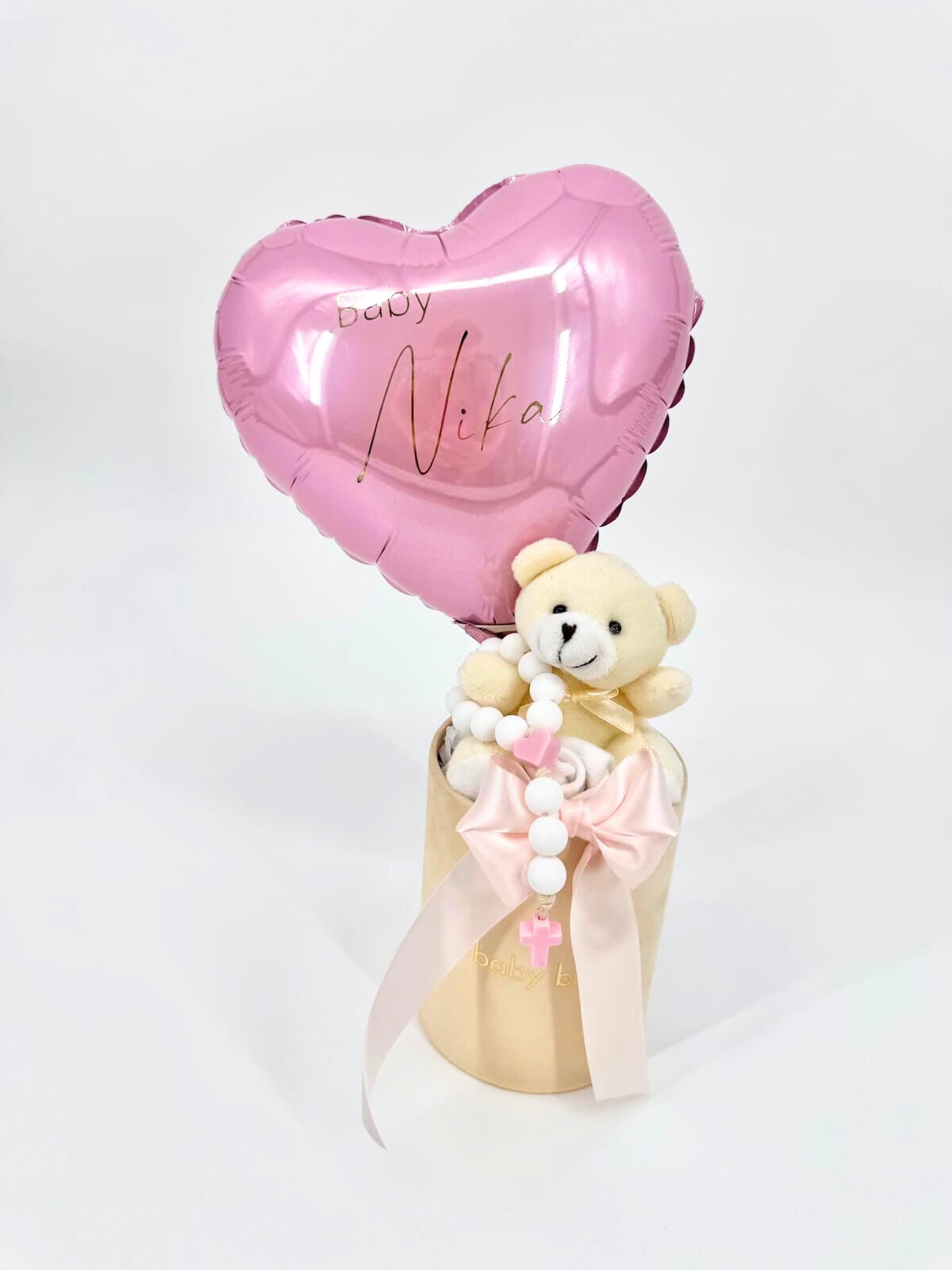 • Dekorativni balon u obliku srca na koji je moguće staviti personalizirani natpis imena bebe kao posebni detalj poklona.