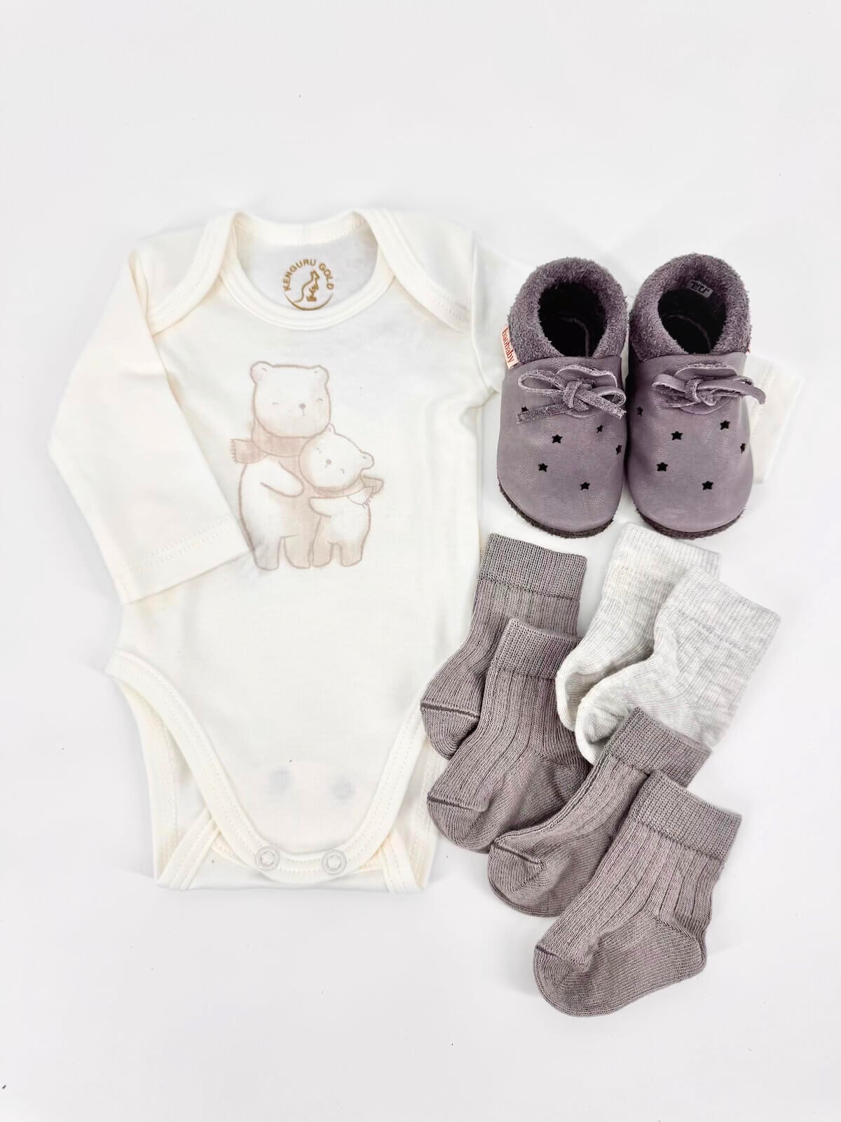 • Body (Kenguru Gold) od 100 % organskog pamuka s okruglim otvorom oko vrata s preklopima za lakše oblačenje bebe bez plača. Svijetle i nježne boje, mek i ugodan na dodir održava kožu bebe suhom bez znojenja.