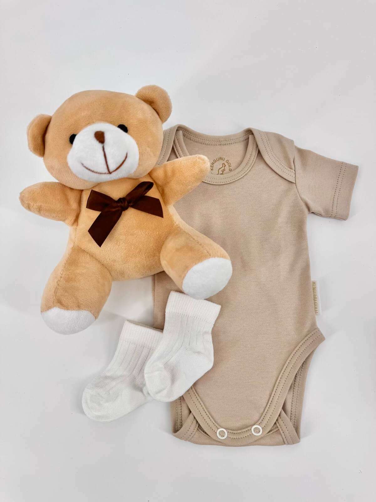 • Body (Kenguru Gold) od 100 % organskog pamuka s okruglim otvorom oko vrata s preklopima za lakše oblačenje bebe bez plača. Svijetle i nježne boje, mek i ugodan na dodir održava kožu bebe suhom bez znojenja.
