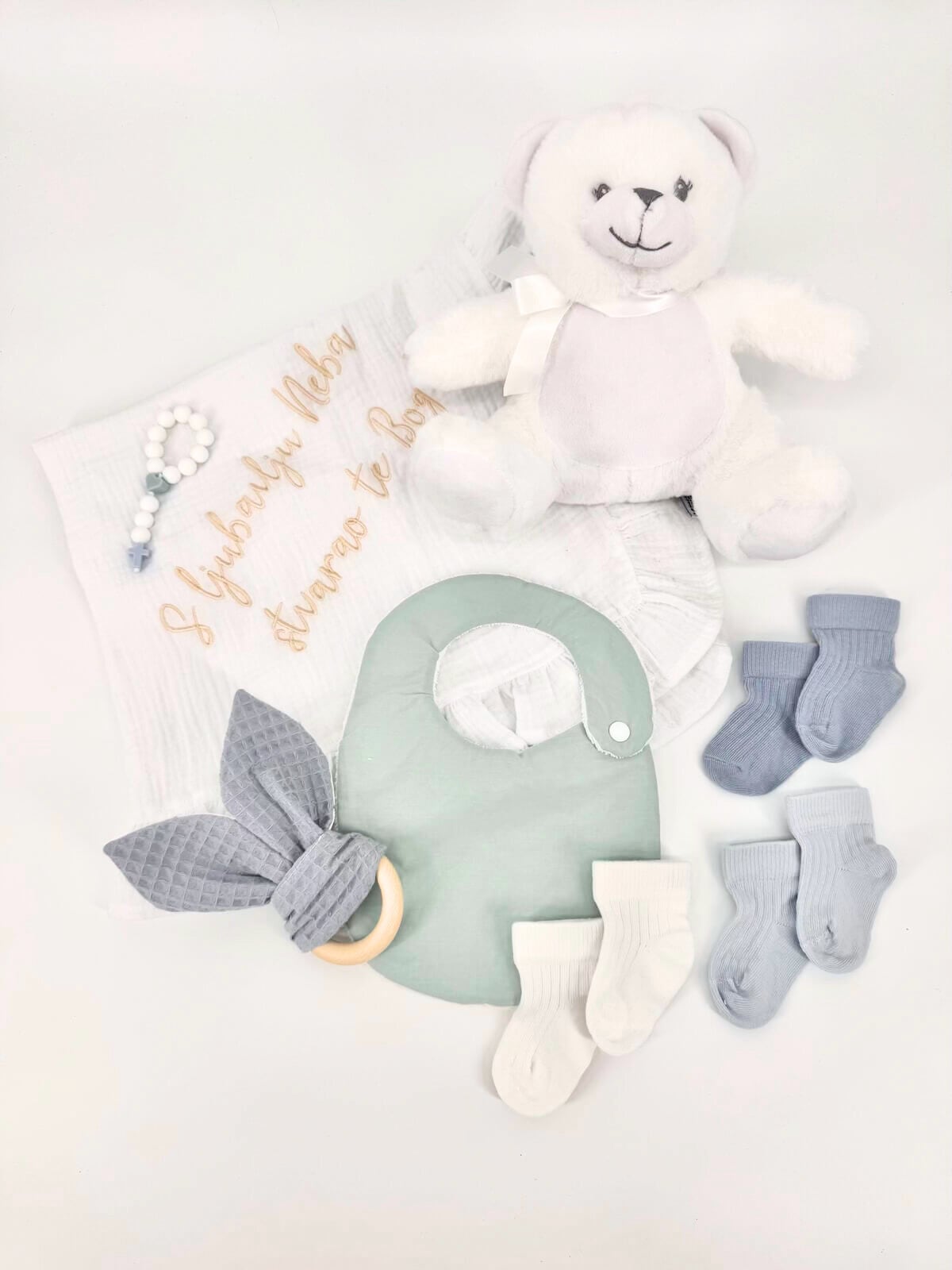 Darujte ljubav u kutiji. Otvoreni poklon box – S ljubavlju neba savršeno je dizajniran poklon, ispunjen pažljivo odabranim proizvodima u kutiji od velura koji spajaju vrhunsku kvalitetu i nježnost prvih dana života. Sve što bebi treba i sve što će roditelje oduševiti već je tu, spremno za nezaboravan trenutak darivanja prvog poklona za rođenje, baby shower ili krštenje.