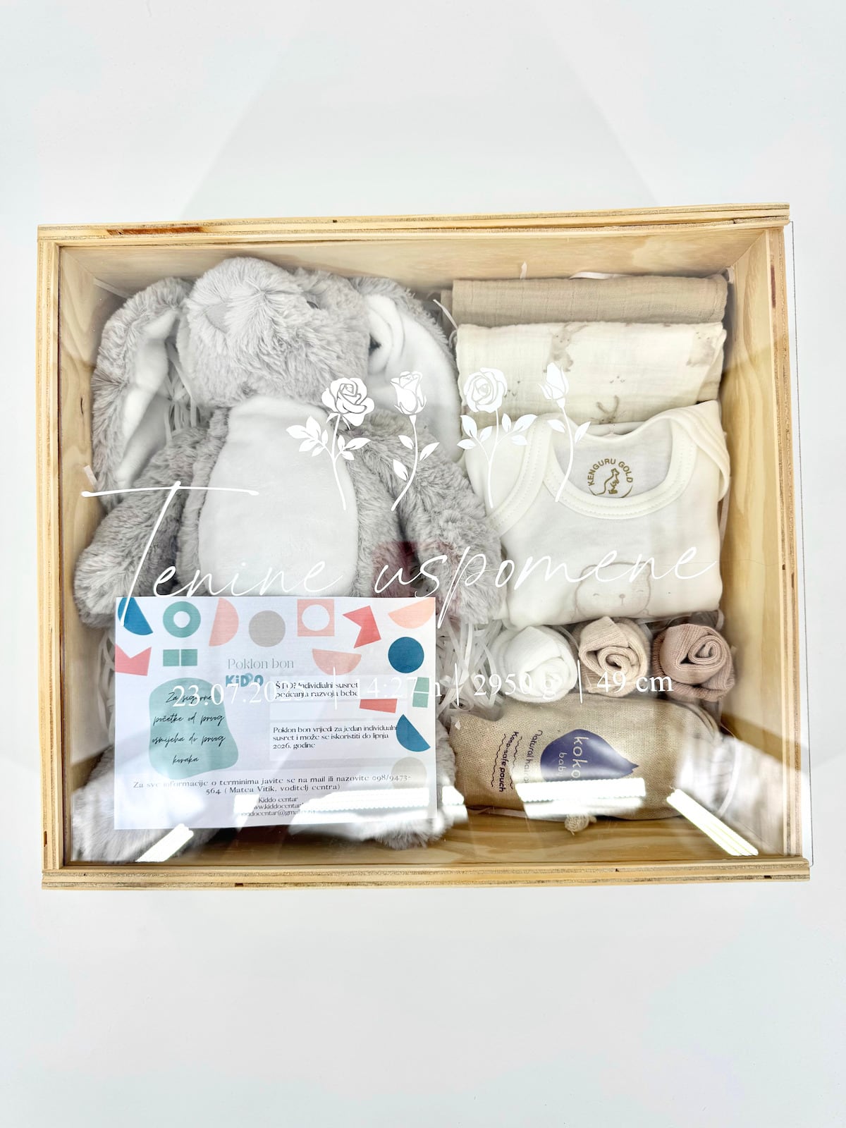Sačuvajte prve trenutke vašeg mališana u elegantnoj drvenoj kutiji s personaliziranim natpisa po vašoj želji. Ova drvena kutija za uspomene idealan je način da čuvate sve najljepše uspomene vašeg djeteta. Unutar kutije pronaći ćete pažljivo odabrane proizvode za prve dane bebinog života – plišanog zeku, pamučne krpice, mekani češalj i mnoge druge korisne proizvode.