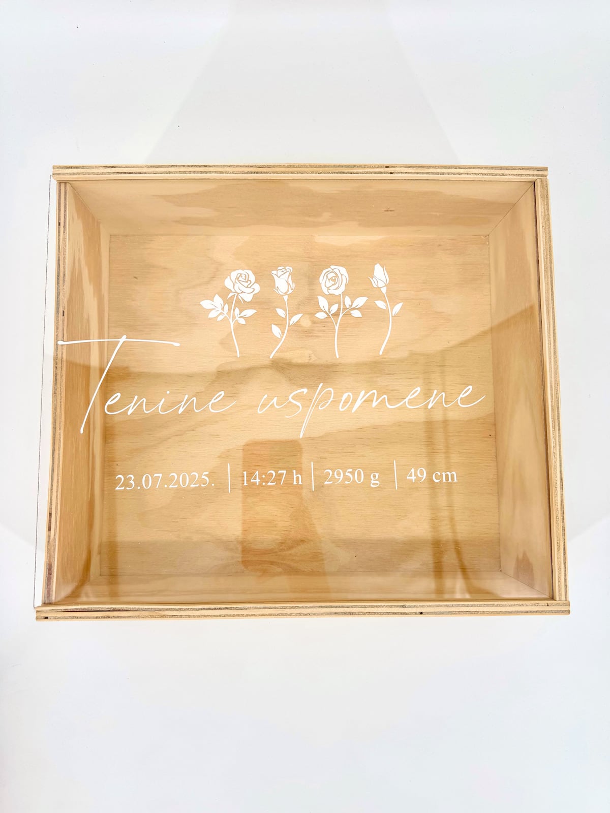Proziran gornji poklopac omogućuje vam da odmah vidite što se sve nalazi unutra, a personalizirani natpis čini ovu kutiju savršenim poklonom za rođenja, krštenja, baby shower ili prve rođendane.