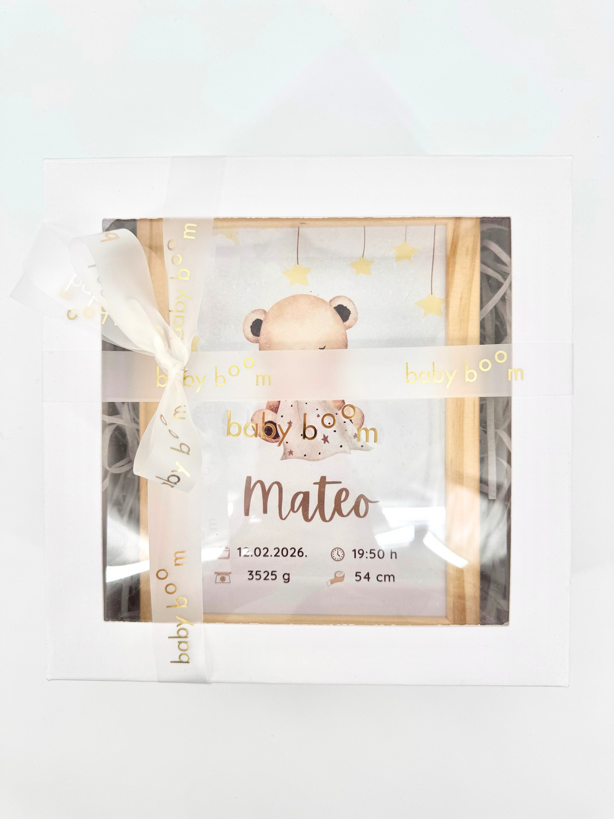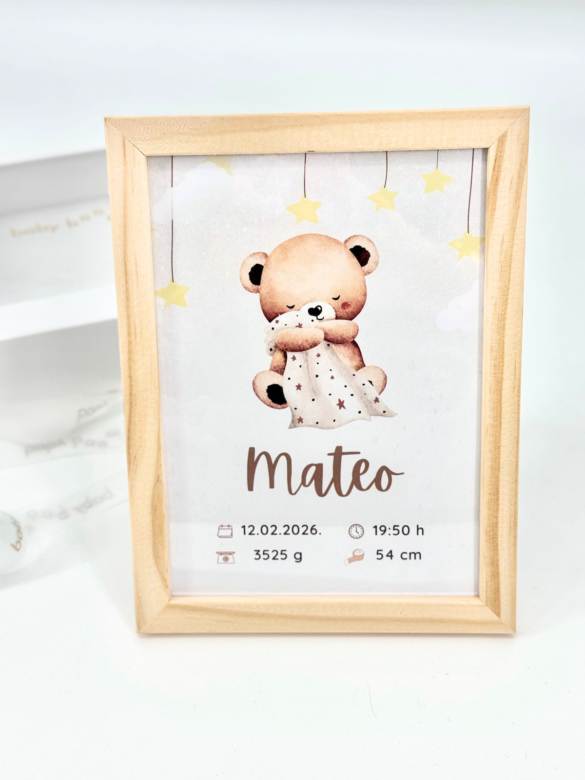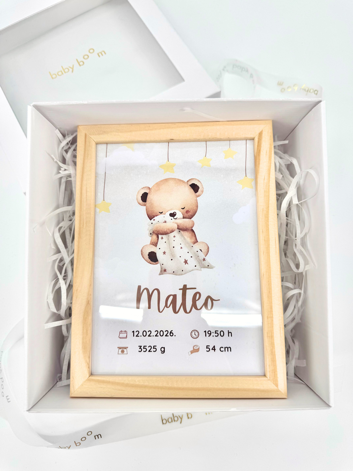 Prvi trenuci života nose uspomene koje zauvijek ostaju u srcu, a ovaj personalizirani okvir stvoren je da ih sačuva na poseban način. Ime bebe, datum i vrijeme rođenja, težina i duljina bebe pretvaraju se u uspomenu koja podsjeća na jedan od najvažnijih i najemotivnijih trenutaka u obitelji.