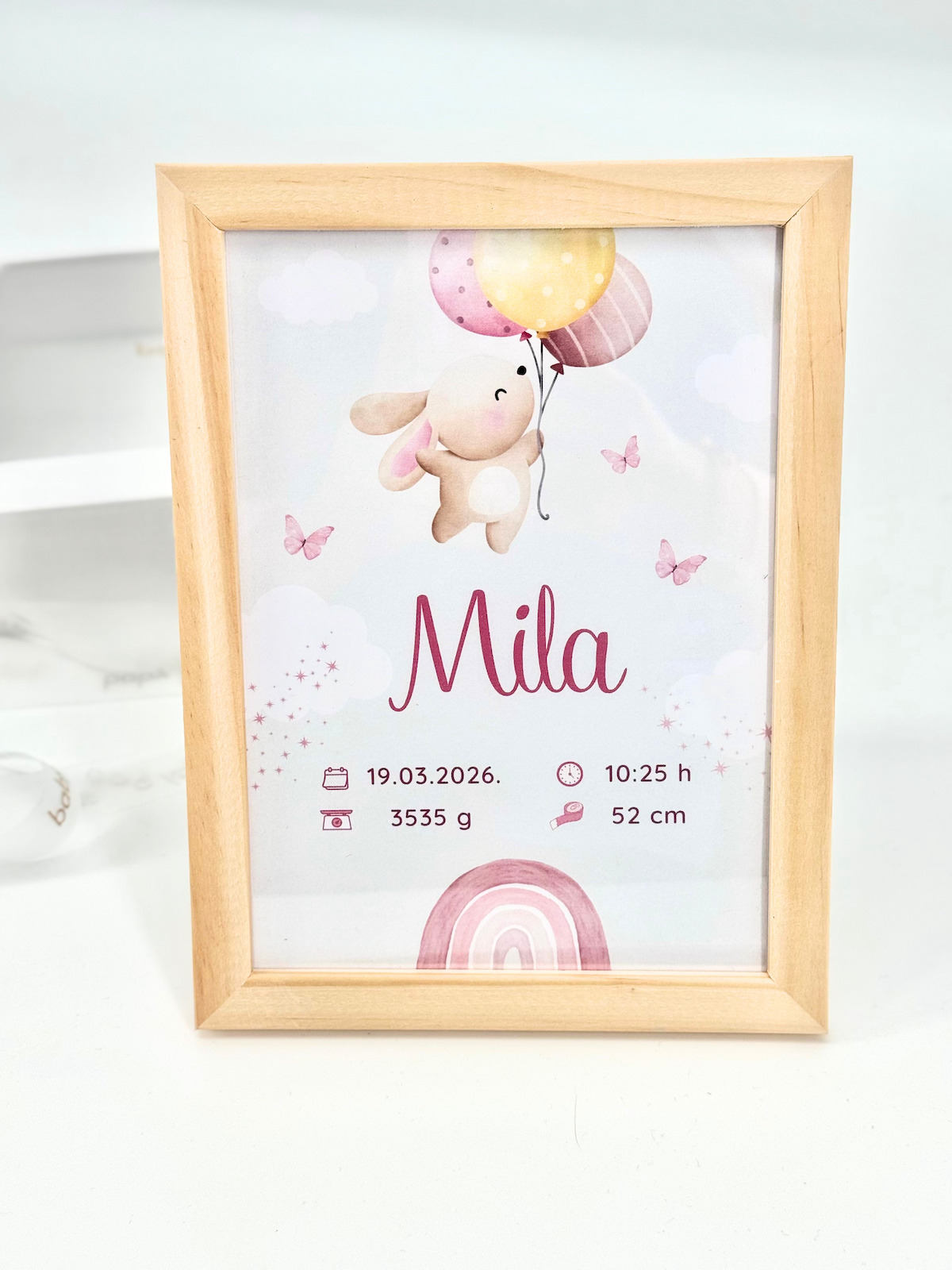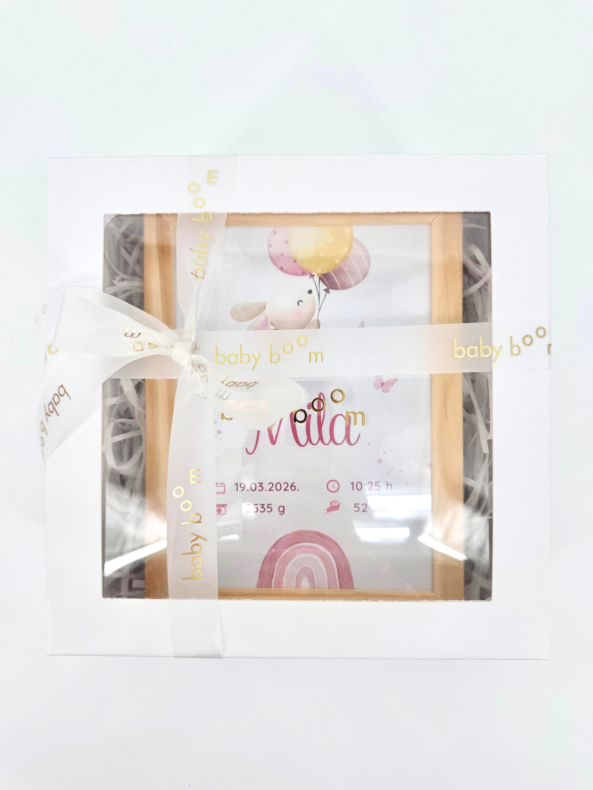 Prvi trenuci života nose uspomene koje zauvijek ostaju u srcu, a ovaj personalizirani okvir stvoren je da ih sačuva na poseban način. Ime bebe, datum i vrijeme rođenja, težina i duljina bebe pretvaraju se u uspomenu koja podsjeća na jedan od najvažnijih i najemotivnijih trenutaka u obitelji.